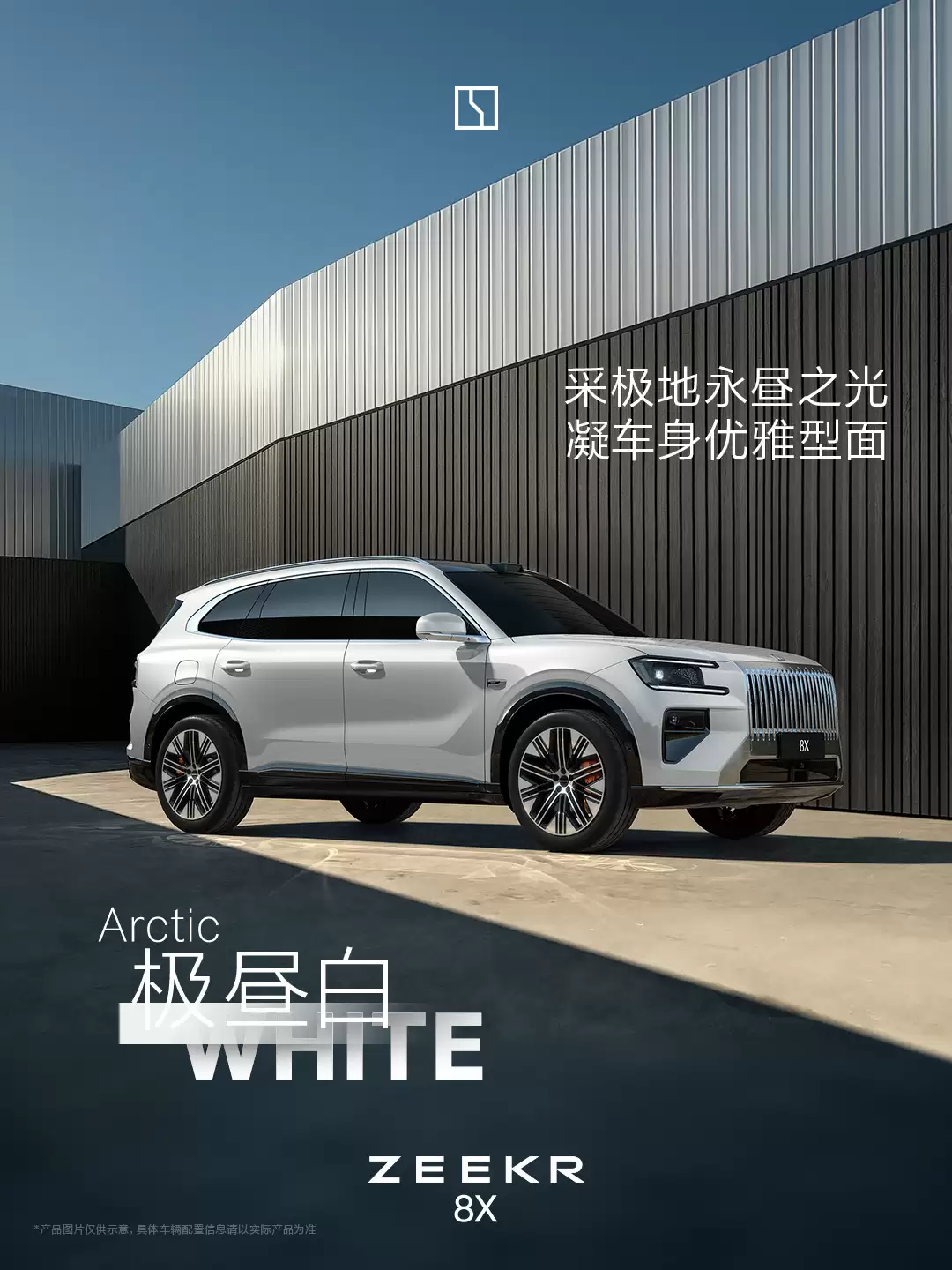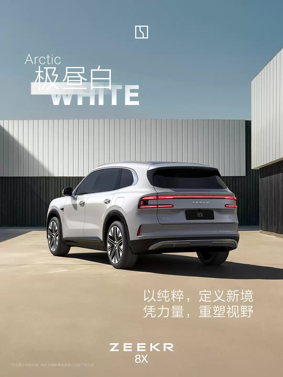 2月6日,极氪汽车正式发布了极氪8X两款全新车身颜色的官方图片,分别为“极昼白”与“极夜黑”。官方形容道:“极昼白,采撷极地永恒之光,纯粹定义新境;极夜黑,取宇宙静寂之力,深邃自成气场。”