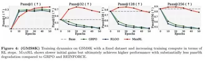 比较在不同 pass@k 设置下各方法随训练中采样计算增加时的优化趋势,可以看到,对于 GRPO 与 RLOO,曲线在早期下降后迅速变平,说明额外采样主要用于降低噪声;而 MaxRL 在不同 k 值下均保持持续下降,推动模型不断逼近一个更接近最大似然的优化目标。