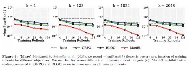 在迷宫任务上,无论测试时的采样预算 k 取何值,随着训练 rollouts 的增加,MaxRL 都能持续降低 −log (Pass@k),而 GRPO 与 RLOO 的改进幅度则明显更早趋于平缓。这一结果直观地展示了 MaxRL 在训练阶段更优的性能–效率权衡。