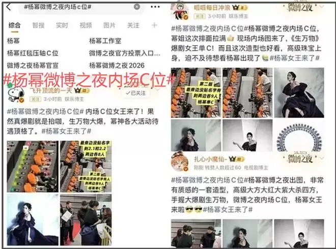 更重要的是,“杨幂微博之夜场内C位”的话题,被发现提前发了出来,不少营销号带着杨幂美照发布炒作。然而按照原本的位置,辛芷蕾才是第二排C位。