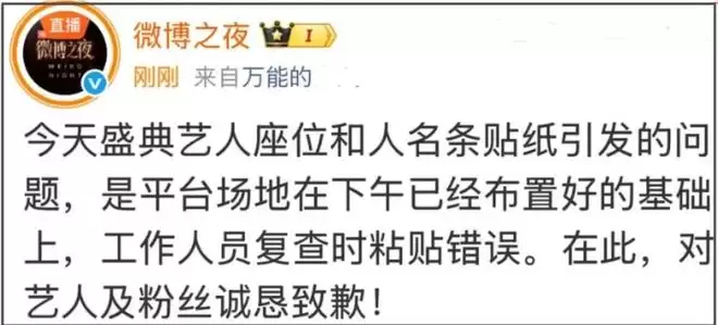 微博之夜的热闹被杨幂座位风波抢占了风头,从被质疑“杨幂撕名牌抢C”到“杨幂工作室艾特主办方微博之夜讨说法”,再到“微博之夜解释座位系工作人员复查失误”,整一出大戏仿佛是工作人员的小小失误造成。