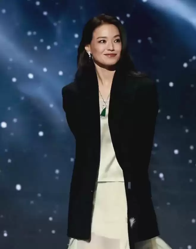 舒淇身穿黑色西装内搭黄色礼服亮相,端庄大方,当了导演的舒淇,气场更强了。