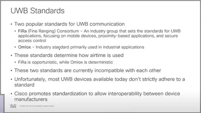 由于这两大标准互不通用,加之市面上许多现有 UWB 设备并未严格遵循任一标准,导致整个技术生态面临严重的碎片化与兼容性挑战;对此,思科明确表示将致力于推动行业标准化进程,以消除壁垒,实现不同厂商设备之间的互操作性。