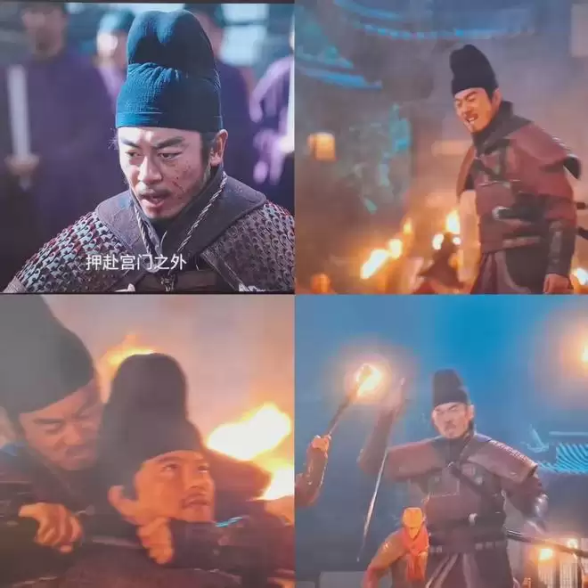 此处必须要高赞扮演赵弘殷的郝平。整部剧中,他的每一个举手投足,都有着强烈而铿锵的节奏。此处他执剑面敌,霸气侧漏,气氛剑拔弩张。