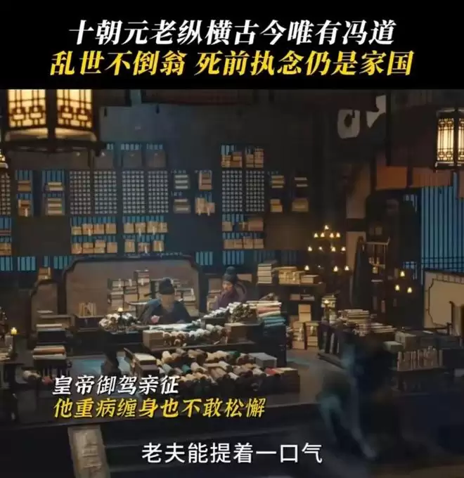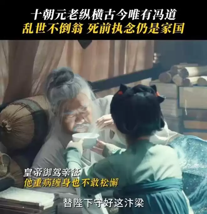 董勇饰演的这位传奇宰相,走得安静又释然。彼时后周世宗郭荣御驾亲征,冯道以73岁高龄留守汴梁,拖着病体硬撑着维系朝局稳定。