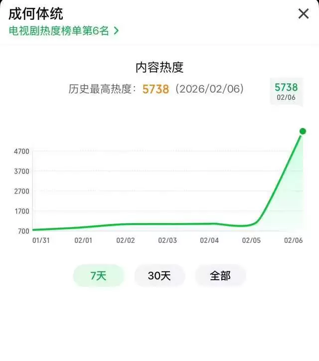 截至2026年2月7日12时,《成何体统》爱奇艺站内热度已飙升至8637,较开播首日暴涨近800点,单日涨幅超1600点,增长曲线陡峭得惊人。作为一部制作成本远低于S+级正剧的古偶轻喜,这个成绩不仅碾压了《生命树》(8258)和《太平年》(7130),更成功跻身爱奇艺历史首播热度总榜前三,与多部爆款大剧比肩。