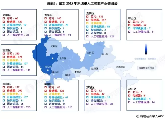 深圳市更是将人工智能单列为“20 + 8”产业集群之一,全力打造人工智能先锋城市。深圳构建起覆盖“基础层-技术层-应用层”的全栈式人工智能产业链,各区域分工明确、协同发展。东部宝安、光明等区域以传感器与芯片制造为核心,打造硬科技底座;西部南山、福田聚焦算法研发,依托丰富场景加速技术转化;中部龙岗、坪山则推动智能网联与新能源汽车深度融合;深汕合作区正探索新城建设与AI深度绑定。