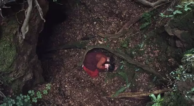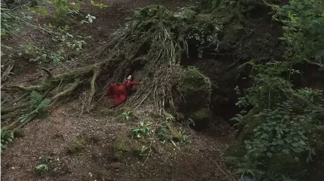 开篇的第一个大全景镜头极为惊艳。身着大红色的Agnes蜷缩草地上,大树林立、郁郁葱葱的森林将她包裹起来,她身后是一个巨大的黑洞,像树洞,也像时光隧道。她像极了躺在母亲子宫里的婴儿一般,静谧、舒适。