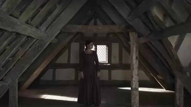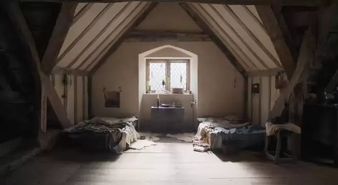 另外一个长镜头之前那个镜头互为映照。当哈姆奈特离世后,同样的长镜头运镜又在这个卧室里慢慢摇了一遍,只是背景中孩子们的声音变了,落幅也没有摇到孩子们学习、玩耍的地方,而是停在转角。多么像一个痛苦不堪的母亲,都没有办法再多看一眼这个曾经充满了嬉笑的地方。