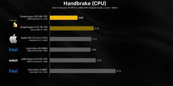 骁龙 X2 Elite - 3:29 骁龙 X Elite - 5:32 M5 - 5:14