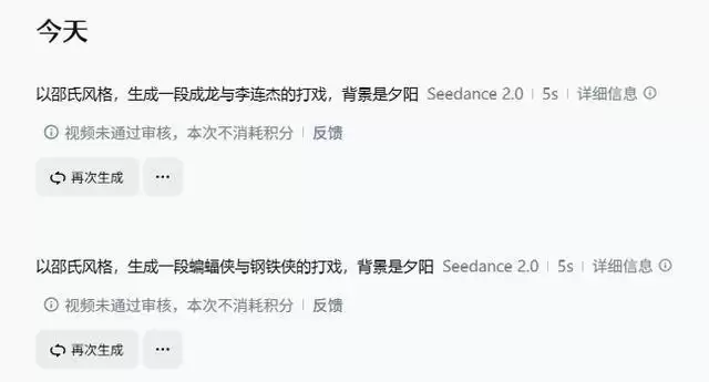 此外,新京报贝壳财经记者在测试中发现,涉及名人或者知名IP版权的视频生成,目前在即梦平台上是有所限制的。如新京报贝壳财经记者在最开始想要生成李连杰与成龙,或者蝙蝠侠与钢铁侠的打戏,但被提示称“视频未通过审核,本次不消耗积分”。