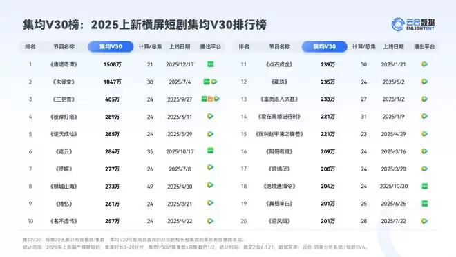在具体项目上,根据云合数据显示,2025上新横屏短剧集均 V 30的前三名分别为《唐诡奇谭》《朱雀堂》《三更雪》,而前两部1508万和1047万的集均 V 30,也超过了2024年该榜单首位《大王别慌张》的623万。同时,《朱雀堂》还以4500万分账票房刷新了行业票房纪录。