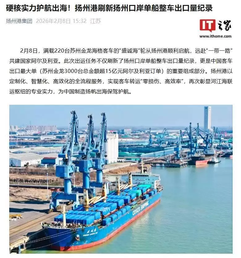 此次出口具有双重意义:它既是扬州口岸2024年首单国产汽车出口业务,也刷新了该口岸整车出口单船装载量的历史纪录。扬州港集团表示,为保障这批客车顺利装船,港口方面协调了专项作业方案,优化了车辆停放、绑扎等流程,确保运输安全高效。随着“盛诚海”轮启航,剩余订单车辆将按计划分批交付,持续助力阿尔及利亚公共交通系统升级。