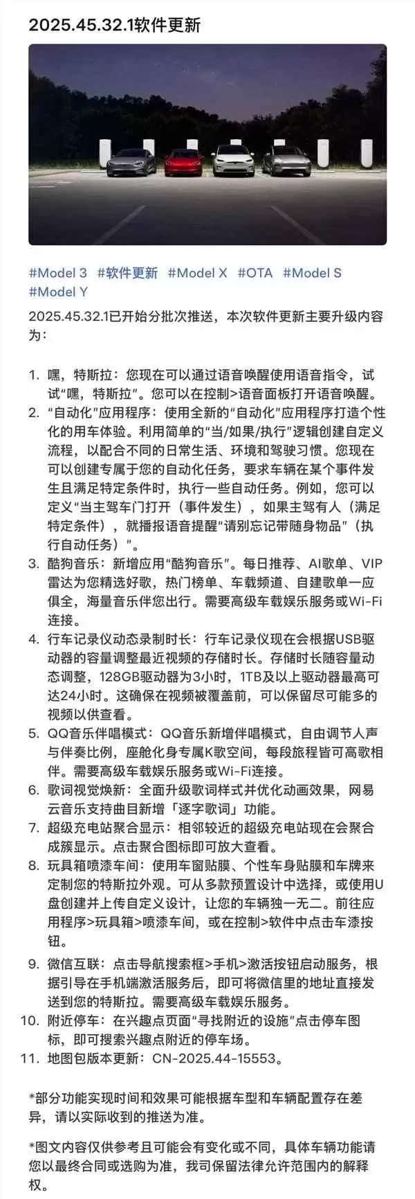 Tesla 2025.45.32.1 OTA升级:语音唤醒体验优化,新增多项功能