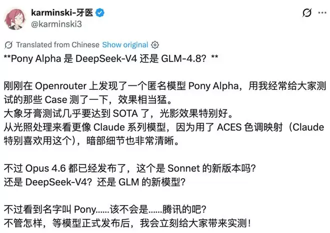 知名博主karminski-牙医也公开猜测,Pony Alpha要么是DeepSeek-V4,要么就是GLM的新模型。