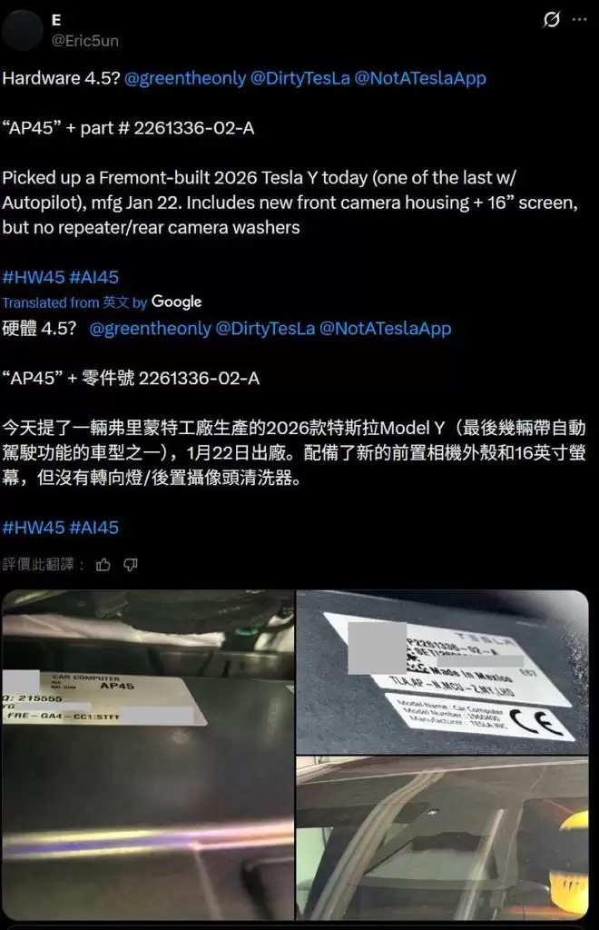 ▲车主透露2026款Model Y搭载HW4.5硬件
