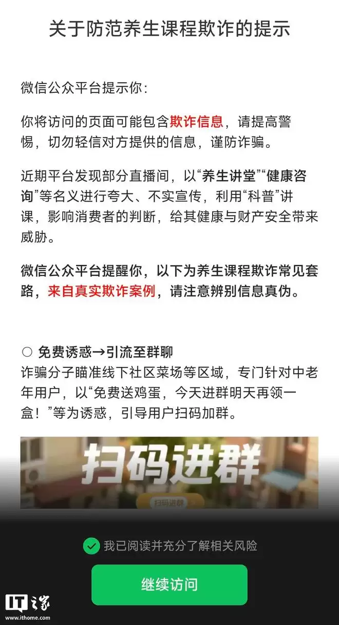 经IT之家实际测试发现,警告窗口明确指出该小程序“近期被大量用户投诉,可能存在欺诈行为”。窗口中,“停止访问”按钮被重点标红。若用户尝试点击“继续”按钮强行使用,则会被引导至一个关于“防范养生课程欺诈的提示”页面,该页面再次提醒用户,其试图访问的内容可能包含欺诈信息。