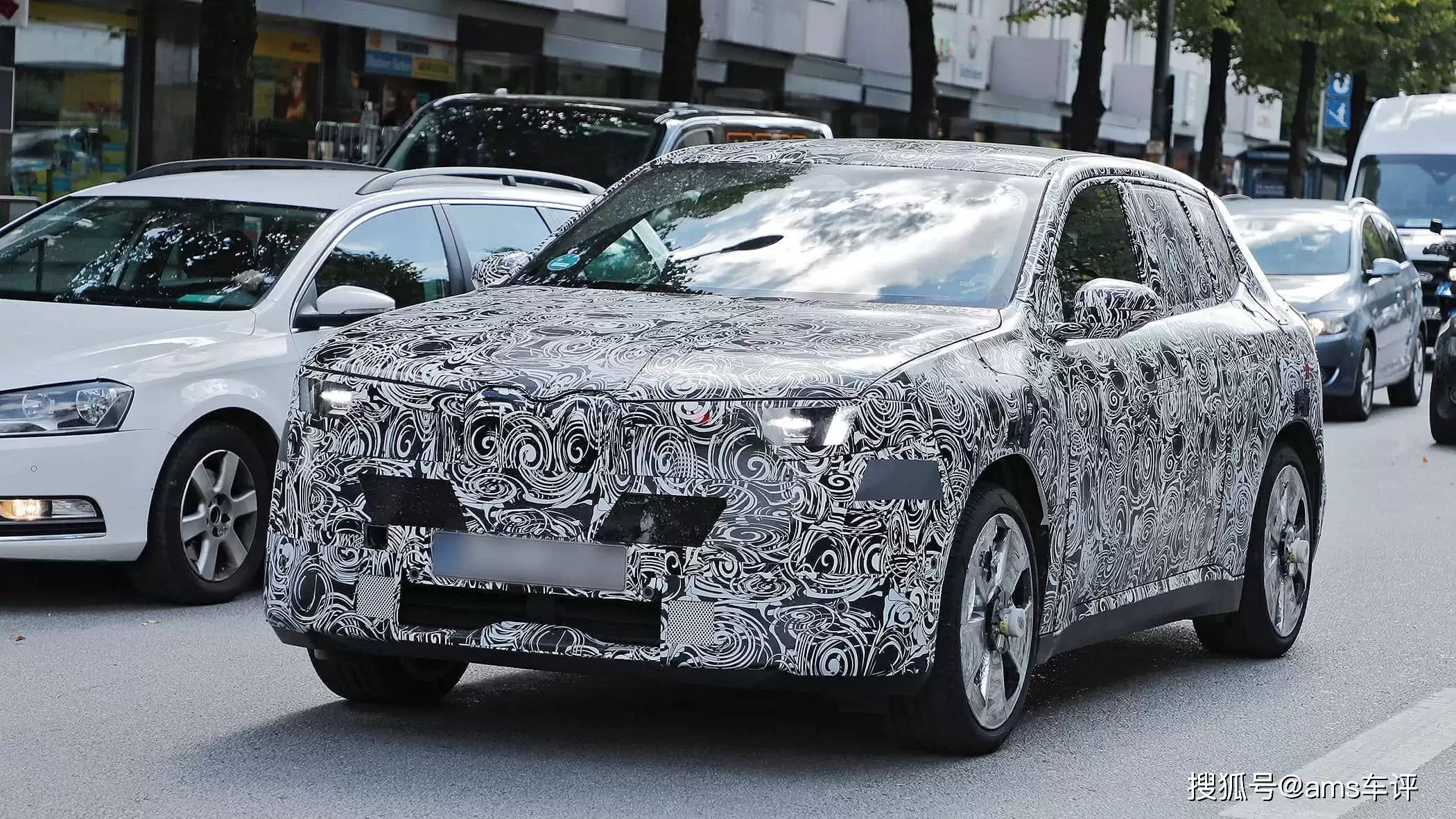 从伪装测试车的照片来看,代号NB5的全新iX1延续了iX3的设计语言,但通过更紧凑的车身比例实现了差异化。新车采用短前后悬设计,车身高度较现款有所降低,轮拱线条也更为收敛。隐藏式门把手、窗外三角区后视镜等细节与iX3保持一致,车尾则通过向尾门内部延伸的灯组营造出宽体视觉效果。有别于iX3将牌照框置于后包围的设计,iX1选择将牌照框集成在尾门上,配合柔和的尾部线条,整体风格更显精致。车头部分,标志性的双肾格栅进一步收窄并向发动机舱盖延伸,两侧被纤细的LED灯组环绕,形成极具辨识度的前脸造型。