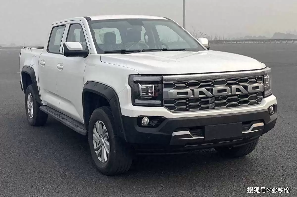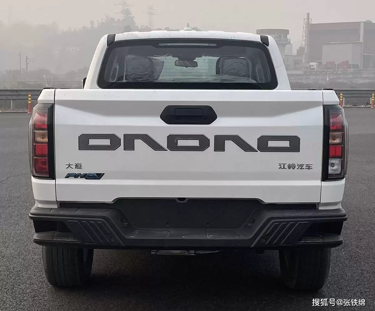 车身侧面轮廓未见大幅改动,黑色的宽体轮眉与龙门架配置进一步强化了其工具属性。新车长宽高分别为5435mm、2030mm、1918mm,轴距达到3270mm,与燃油版尺寸完全一致,确保了车内空间与载货能力不受影响。车尾设计简洁利落,后围板上的放大字母车标与醒目的“PHEV”标识,清晰表明了其新能源身份。