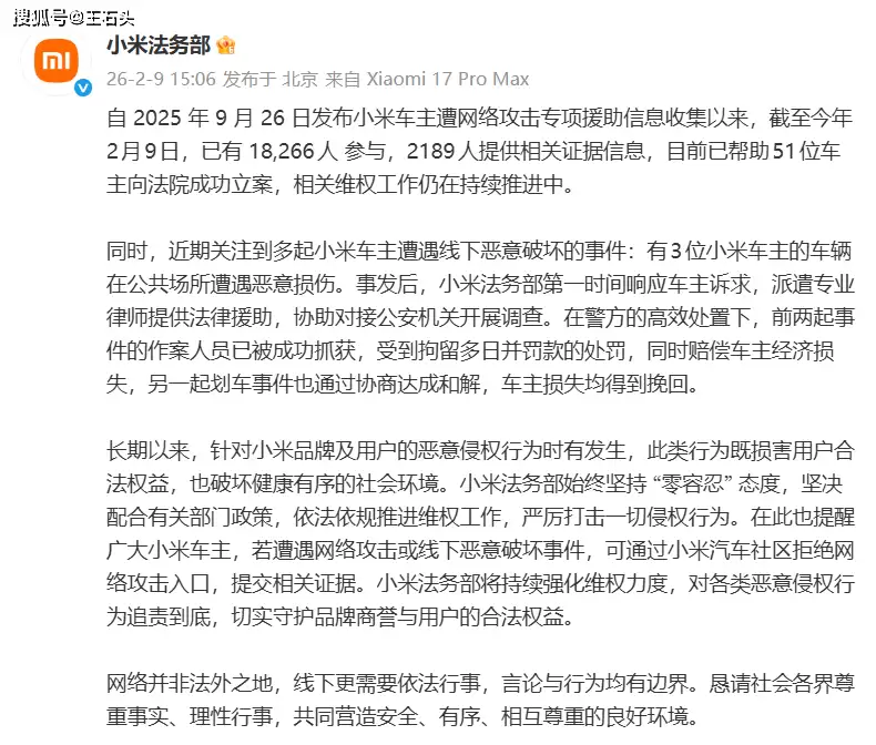 数据显示,在所有反馈的案例中,有2189名车主提供了完整的证据链,其中51起案件已被法院正式立案受理。近期已有两起案件的涉案人员被依法拘留并处罚款,另有一起涉及划车的事件中,小米协助车主成功追回了损失。这些案例表明,法律对恶意破坏行为的制裁力度正在不断加大,违法者终将为自身行为付出高昂代价。