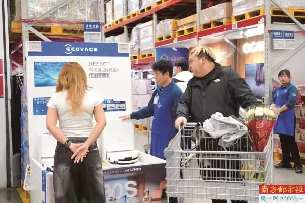 消费者在深圳商超内选购扫地机器人。