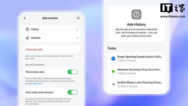 用户还可以查看自己的广告互动记录,并可随时清除。此外,OpenAI表示用户可以关闭广告、提交反馈、查看广告投放原因,并管理广告个性化设置。