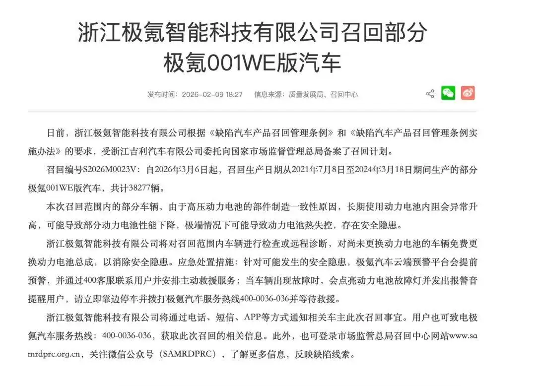 此次主动召回源于极氪云端监测系统对动力电池的潜在风险预警。经检测发现,部分车辆因电池内部组件制造工艺存在一致性偏差,长期使用后可能出现内阻异常升高、性能衰减等问题。为消除安全隐患,企业将为召回车辆免费更换全新电池,并完整保留原有三电系统的终身质保权益。