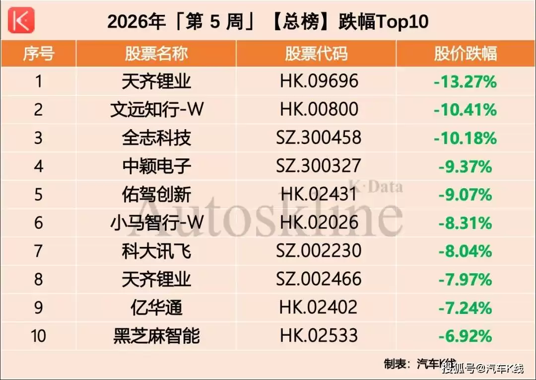 在跌幅方面,天齐锂业H股下跌13.27%垫底,其A股跌幅也达到7.97%。天齐锂业上周大跌主要受两个负面消息影响:一是公司计划以每股45.05港元配售新股,较停牌前收盘价折让约9%,同时发行可转债,总计筹资超58亿港元,市场解读为公司急需资金;二是公司拟择机对参股公司中创新航和SQM部分股权进行处置,以提升资产流动性。同处自动驾驶与智能驾驶芯片赛道的文远知行、佑驾创新、小马智行、黑芝麻智能也纷纷出现明显下挫。文远知行因公告2018年股份计划不符合联交所规定,并建议采纳2026年股份计划,引发市场对公司治理合规性的关注。小马智行发布盈利预警,预计2025年度净亏损约6900万美元至8600万美元,较2024年同期有所收窄,但持续亏损提醒投资者公司仍处于“烧钱”阶段,盈利拐点未至。黑芝麻智能则因股东“黑五类”在2月2日至4日合计减持270万股,且本次减持系司法强制执行所致,股价受到压力。佑驾创新周五盘后公告称联交所就本公司H股全流通授予上市批准,或为全新交易周带来新气象。