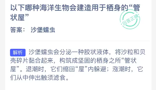 1、题目:以下哪种海洋生物会建造用于栖身的“管状屋”?