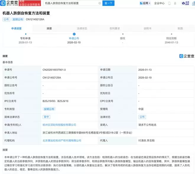 企查查APP信息显示,近日,杭州云深处科技有限公司一项名为“机器人跌倒自恢复方法和装置”的专利正式公布。根据该专利摘要,其方法主要包括:首先,实时检测机器人的当前姿态;当判断其当前姿态符合预设的跌倒条件时,系统会依据这一姿态确定机器人的当前参数序列,并调取预设的标准参数序列;随后,将当前参数序列与预设参数序列一并输入到经过预先训练的跌倒恢复模型中,由此输出一套针对性的自恢复策略。这份专利资料特别指出,其核心的跌倒恢复模型是通过模拟学习与强化学习相结合的方式进行预先训练而获得的。最终,通过执行模型输出的自恢复策略,机器人能够自主恢复至稳定的站立姿态。这项技术有效解决了传统机器人跌倒恢复方法中普遍存在的局限性问题,显著提升了人形机器人在跌倒后的自主恢复能力,使其反应更加稳定、鲁棒且拟人化。