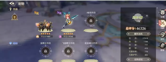 所有已获得的宠物都能在宠物界面中查看,并在这里进行后续的培养操作,主要包括升级、升阶和进化三个方面。