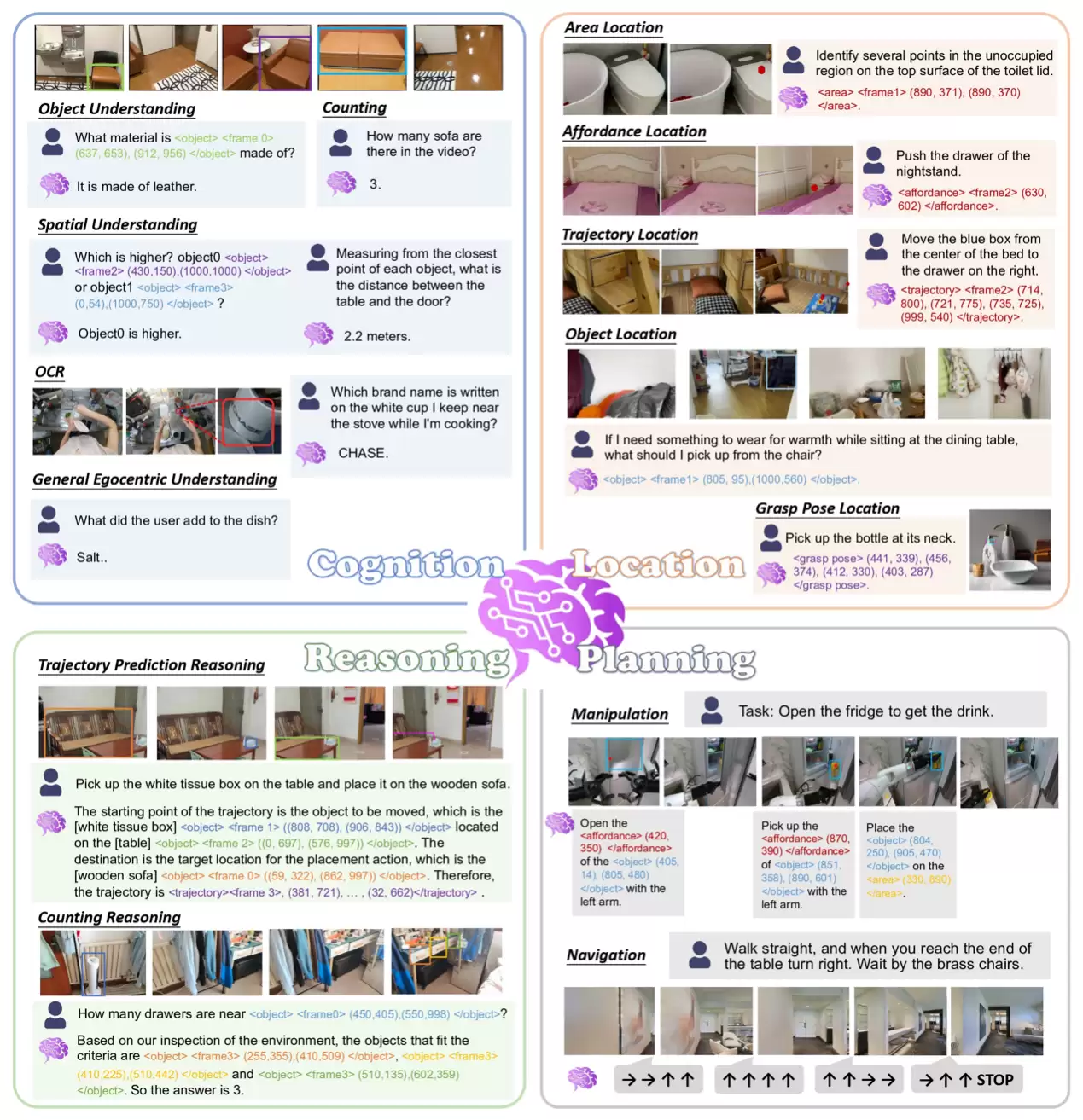 为了攻克这些难题,达摩院的Rynn模型创造性地引入了时空记忆和物理世界推理能力,这是机器人与环境互动所需的两项核心技能。时空记忆能力能让机器人在其完整的历史记忆中定位物体、目标区域,甚至预测运动轨迹,从而赋予其全局时空回溯能力。物理空间推理则不同于传统的纯文本推理范式,RynnBrain采用了文本与空间定位信息交错进行的推理策略,确保其推理过程紧密扎根于物理环境,大大削弱了幻觉问题。举例来说,运行RynnBrain模型的机器人,在执行任务A时若被突然要求先去处理任务B,它能记住任务A的时间和空间状态,等完成B后继续无缝工作。
