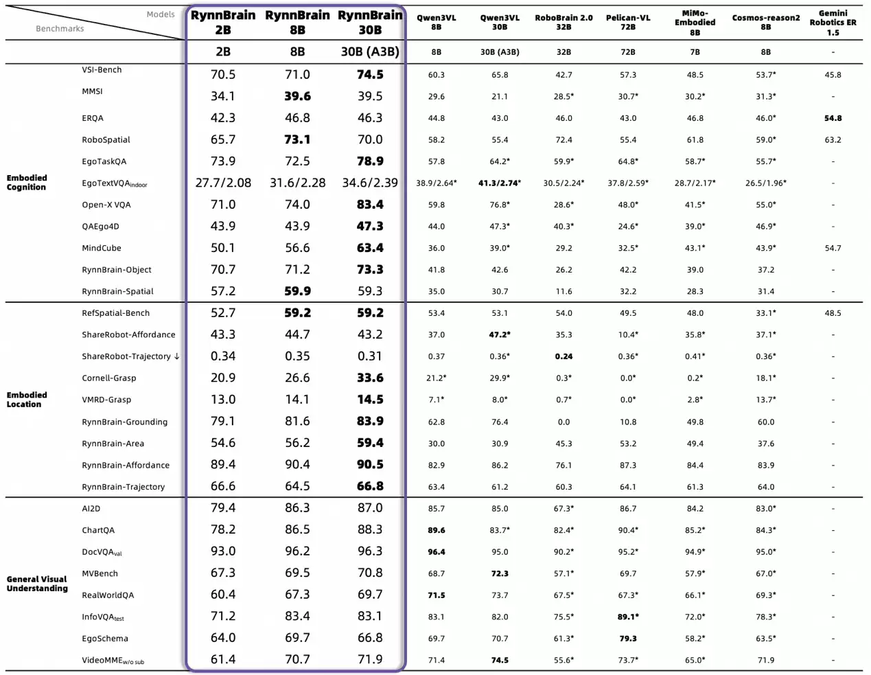 RynnBrain基于Qwen3-VL进行训练,并采用自研的RynnScale架构进行优化,同等资源下训练速度提升两倍,训练数据量超过2000万对。结果显示,RynnBrain能力全面,性能领先,在16项具身开源评测榜单上达到领先水平,涵盖了环境感知与对象推理、第一人称视觉问答、空间推理、轨迹预测等,超越了谷歌Gemini Robotics ER 1.5、英伟达Cosmos Reason 2等行业顶尖模型。