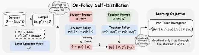 核心机制:该框架将模型配置为两种状态。教师策略在输入中包含 「特权信息」(如标准答案或经过验证的推理轨迹),能够产生高质量的 Token 概率分布;而学生策略则在不接触特权信息的情况下仅凭题目进行作答。