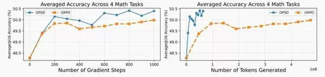 在 MATH 和 GSM8K 等高难度推理基准测试中,OPSD 展现了极高的学习效率:它在 Token 利用率上比传统的 GRPO 算法高出4-8 倍。实验证明,SFT 虽然能提供初始方向,但 OPSD 能够更进一步地挖掘模型内在的“推理潜力”,证明了通过特权信息诱导出的自我博弈,是实现推理能力飞跃的一条捷径。