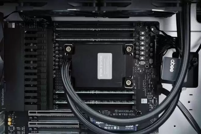 超大的水冷头与水泵采用了分离设计,水泵在其中一根水冷管上。