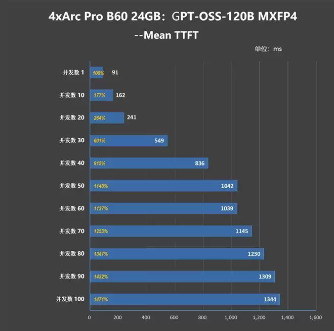 在运行1200亿参数的GPT-OSS-120B时,Arc Pro B60 24GB在预填充(Prefill)阶段展现出了极强的爆发力,并发数为1的时候,Mean TFT (首字延迟)仅为91.37ms。