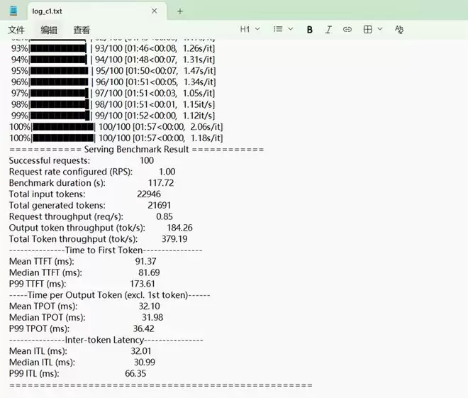 平均 ITL (逐词延迟) 为 32.01 ms,输出吞吐量则为184tok/s。