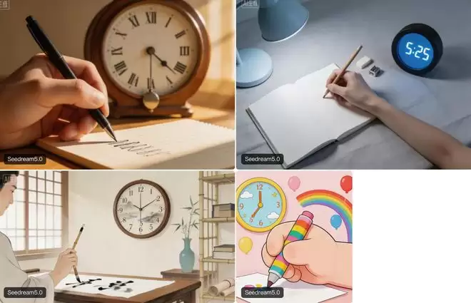 智东西还比较了Seedream 5.0与Nano Banana Pro的生成效果。一个超难提示词为“生成一个用左手写字的人,背景有一个显示5:25的模拟时钟”,Seedream 5.0与Nano Banana都失败了,要么是拿笔的手不对,要么是背景的钟表时间不对。