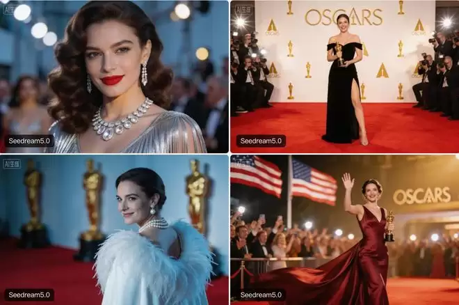 当智东西的提示词为“最新奥斯卡获奖者红毯风格”时,Seedream 5.0可以直接生成有红毯、背景板、摄影师的完整图像,背景板还有不少奥斯卡的小金人。
