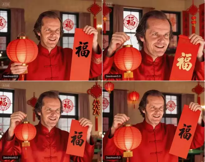 根据参考图生成图片方面,智东西上传了最近热度超高的《闪灵》男主杰克,并让Seedream 5.0“生成这个人的拜年图片,主人公要身有年味的服装,手拿灯笼和对联”。