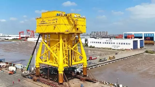 台风“竹节草”突袭长江口,启东基地现场总指挥连夜攻关,制定出“技术全前置+防护早部署”方案,利用三维建模软件拆分结构、排查隐患。待气象警报解除,团队迅速进场,精准完成合拢装配定位焊接。历经2个月的日夜奋战,这座高达39米、重达1900多吨的海底算力“硬核平台”终于在启东基地码头完成制作,整装待发。