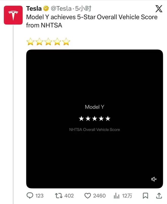 2月10日,特斯拉公司通过其官方社交媒体账号X宣布,旗下Model Y车型荣获美国国家公路交通安全管理局(NHTSA)颁发的五星整体车辆安全评级。