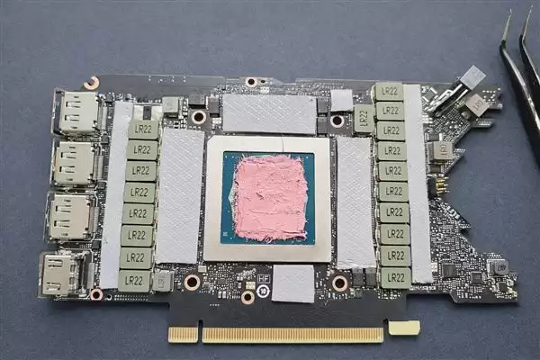 显存位多达20个,正反各一半,每颗1GB组成总计20GB。注意还有四个空焊位。
