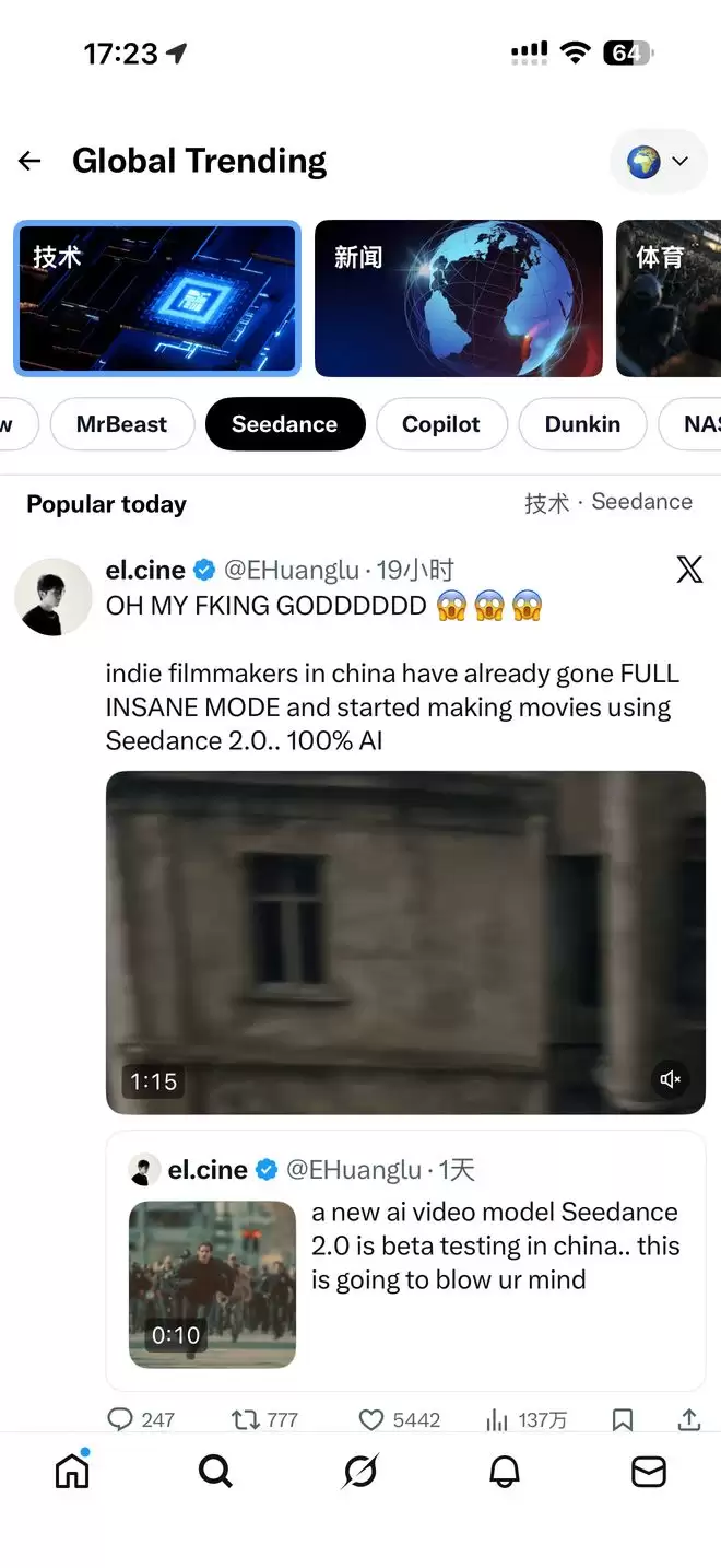 与此同时,Seedance 2.0还在海外网络疯狂刷屏。今天看到它已经登上推特趋势榜了。由于它只在字节国内的部分产品内测,所以海外博主都在求邀请码。这反差,倒真是有点“墙内开花墙外香”的意味了。