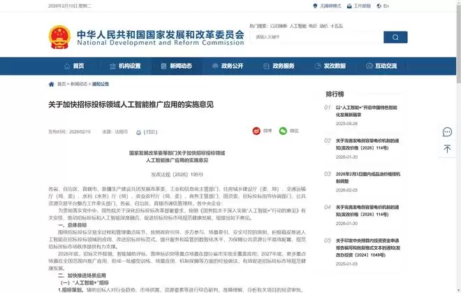 2月10日,国家发展改革委会同相关部门发布了推进人工智能在招标投标领域深化应用的实施意见。文件指出,将围绕招标、投标、交易、监管等全流程核心环节,遵循政府引导、多方协作、场景驱动、安全可控的基本原则,积极稳妥地推动人工智能技术在招投标活动中的应用。此举旨在优化传统招投标模式,提升服务与监管的数字化、智能化水平,为保障公共资源公平高效配置、规范招投标市场秩序提供更有力的支撑。