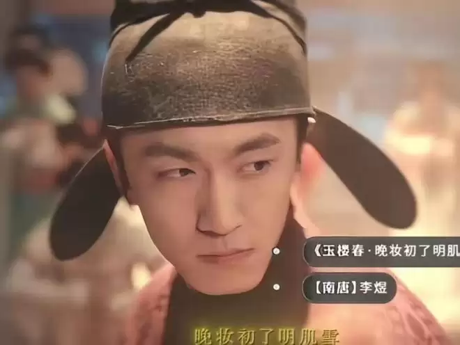 此时的他还不是愁情满怀的南唐后主,穿着绛红色官袍,一副闲散王爷姿态。弹幕里感叹着“那个男人来了”,“词皇驾到”,随后就刷起了“春花秋月何时了”“小楼昨夜又东风”等名句。
