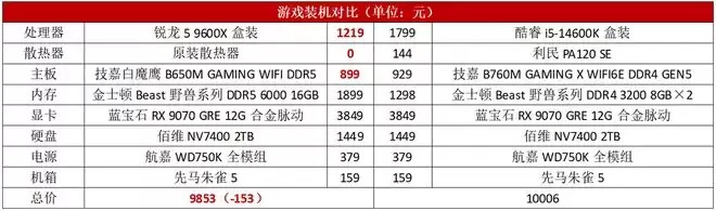 与此同时,由于功率、发热控制更好的缘故,锐龙5 9600X使用盒装自带的原装散热器就能满足日常使用的需求。而酷睿i5-14600K盒装并没自带散热器不说,其最高功率甚至达到了181W,需要搭配一款百元价位的散热器才行,又增加了成本。这就是在装机总成本上,锐龙5 9600X平台反而便宜了100多元的原因所在。