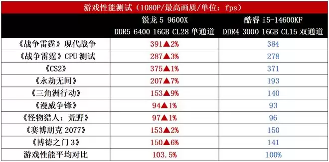同时因为单通道内存性能下降,锐龙5 9600X平台的性能发挥会受到一些制约。即便如此就实际的游戏测试表现来说,依然是锐龙5 9600X+DDR5 6000 16GB单通道内存依然全面领先。锐龙5 9600X平台获得了153fps的平均帧率,较于酷睿i5-14600K平台的140fps,领先幅度达到了9%,是所有游戏中差距最大的。在《博德之门3》CPU和《永劫无间》中,锐龙5 9600X平台也分别领先了7%和6%,其余游戏中的优势在1~3%不等,综合所有测试项目,锐龙5 9600X平台平均领先3.5%。