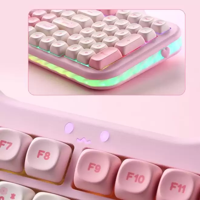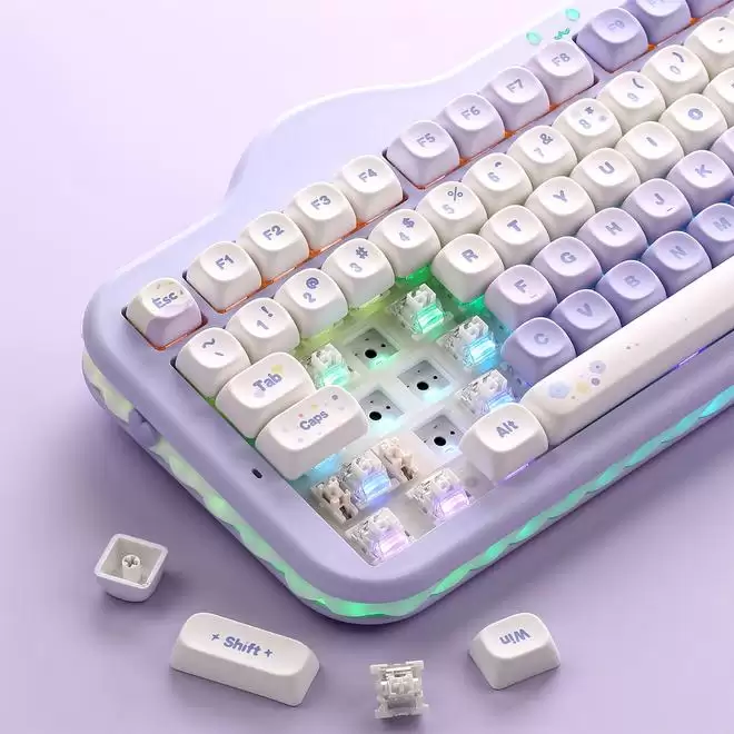 YUNZII C98延续了系列标志性的猫咪笑脸状态指示灯、“三明治”侧裙和小鱼造型2.4GHz接收器等萌系设计元素,提供椰奶V2轴与糖果轴两种线性轴体开关,包含粉、米、紫三种配色方案。